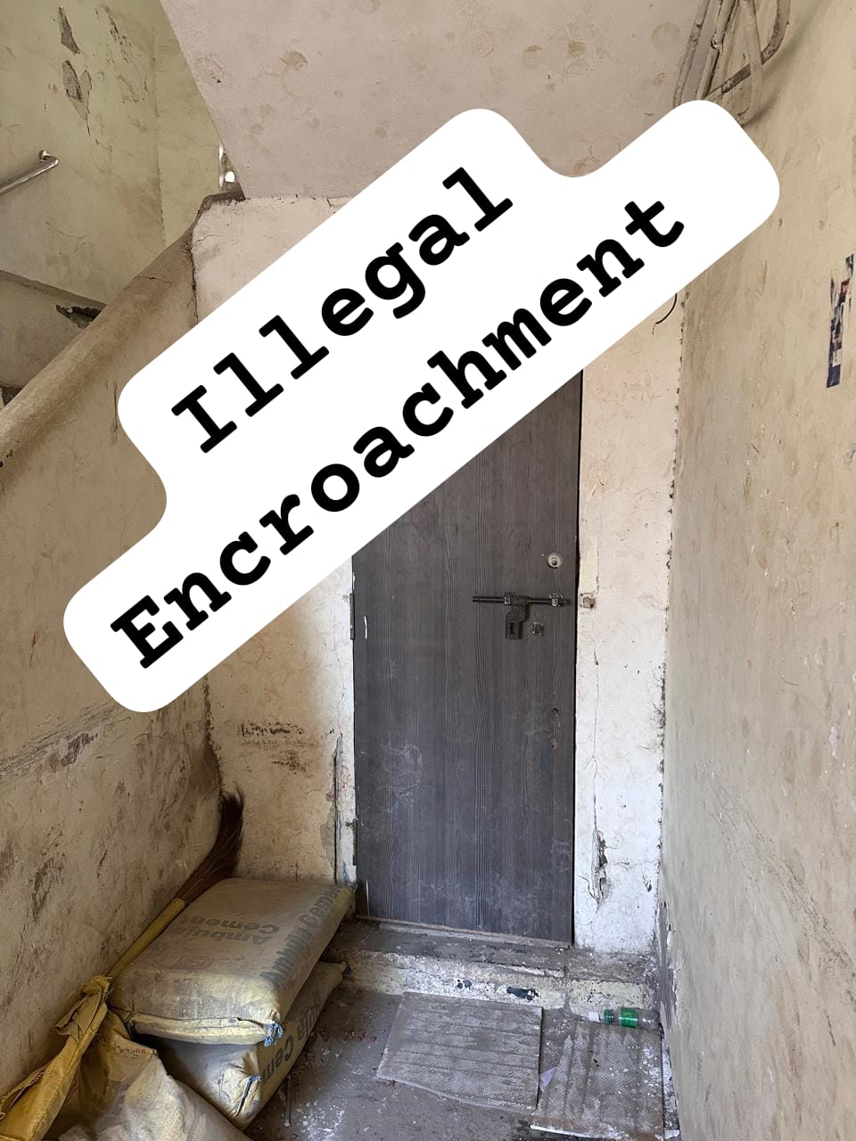 इन तीनों ने मिलकर सीढ़ियों के नीचे बने आपातकालीन निकास मार्ग (फायर सेफ्टी एक्जिट) को भी बंद करके वहां कमरा बना लिया है। यह कार्य *फौजदारी लापरवाही की श्रेणी में आता है और इमारत के सभी निवासियों की जान को संकट में डालता है।