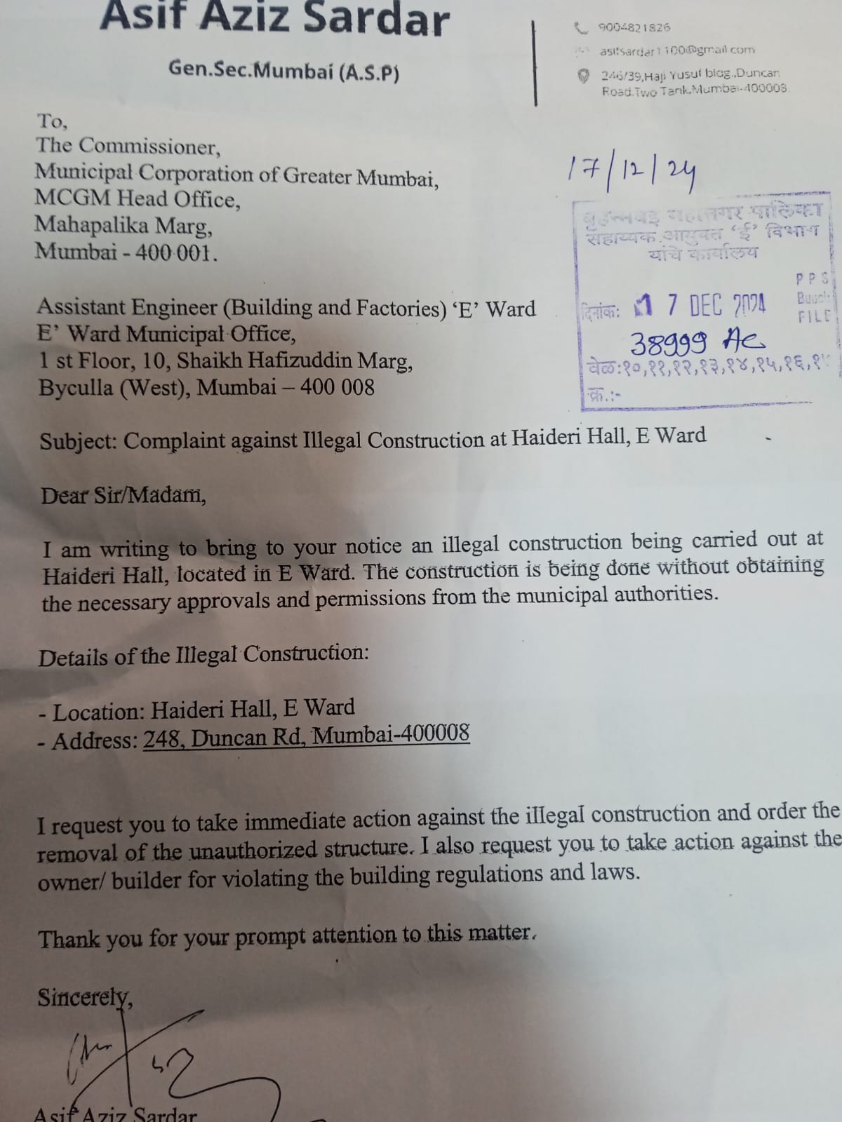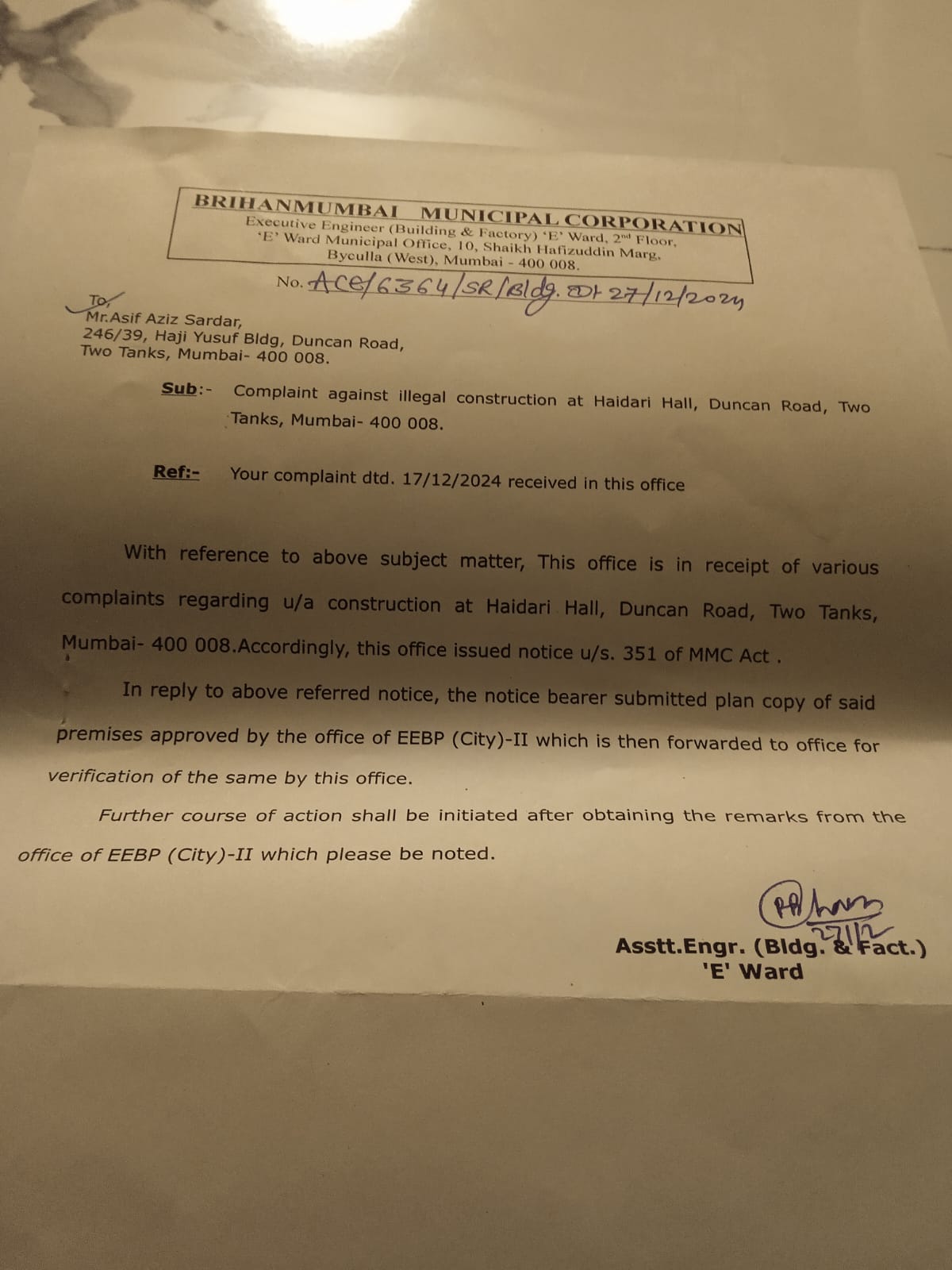 *मुंबई, 21 अप्रैल:* मुंबई के ई वॉर्ड स्थित हैदरी हॉल (पता: 248, डंकन रोड, मुंबई-400008) में एक अवैध निर्माण कार्य की शिकायत सामने आई है। यह निर्माण बिना नगरपालिका की आवश्यक मंजूरी और अनुमति के जारी है, जिससे संबंधित नियमों और कानूनों का उल्लंघन हो रहा है।
