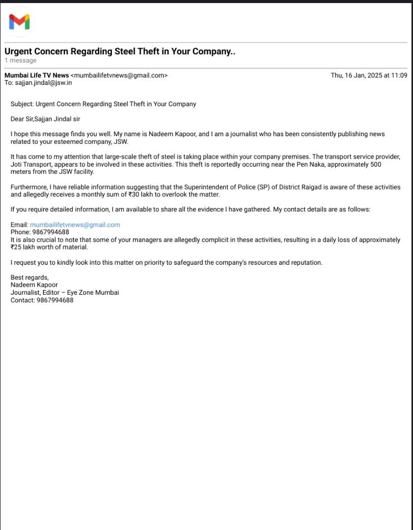हमने इस मामले में जेएसडब्ल्यू ग्रुप के चेयरमैन एवं सीईओ श्री सज्जन जिंदल को भी शिकायत पत्र भेजा है और कंपनी के उच्चाधिकारियों से भी संपर्क किया है। अब देखना यह होगा कि क्या जेएसडब्ल्यू प्रबंधन इस संगठित चोरी के रैकेट पर लगाम लगाने में कामयाब हो पाता है या नहीं।